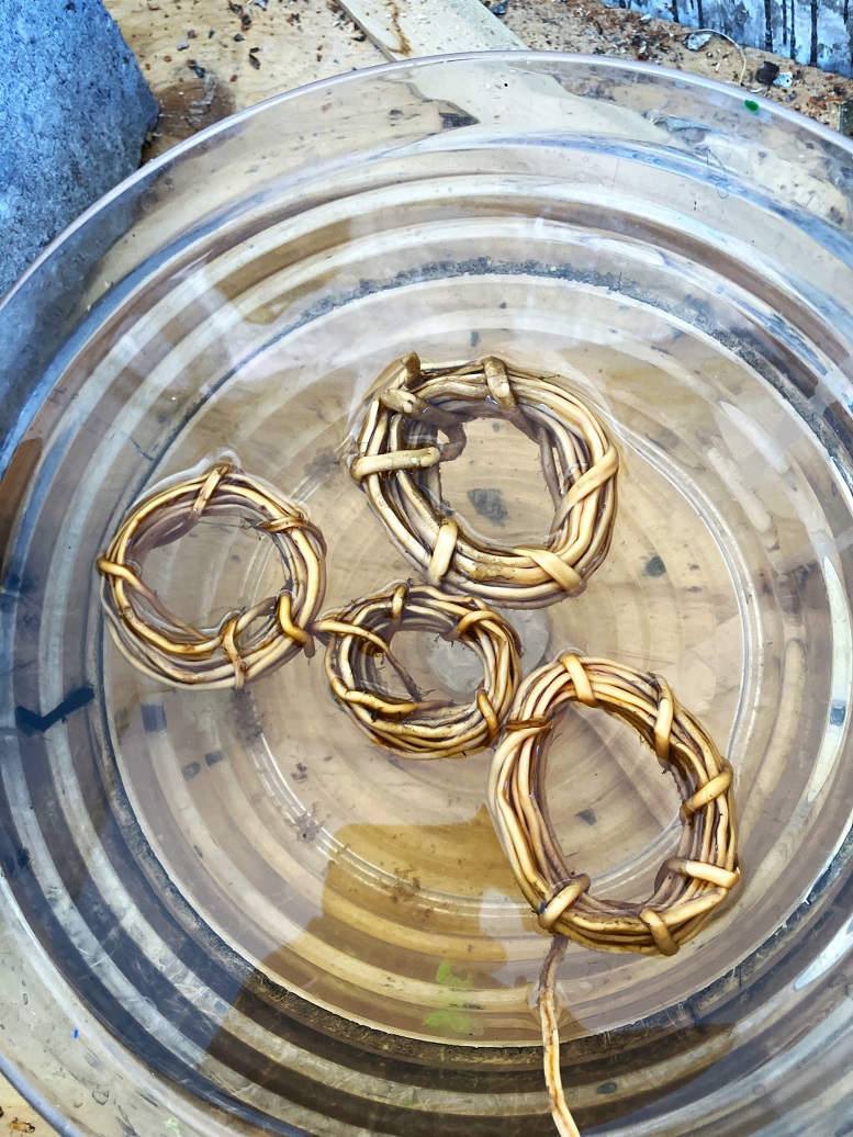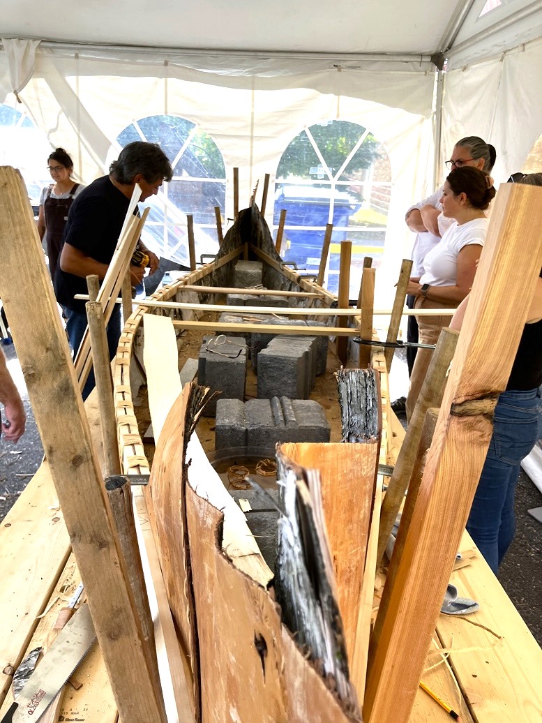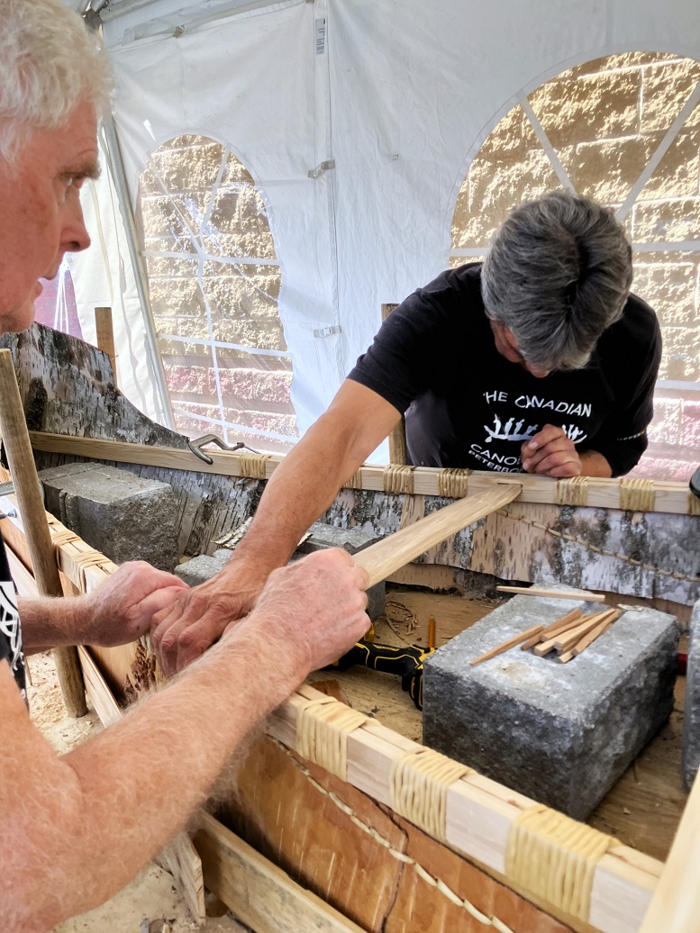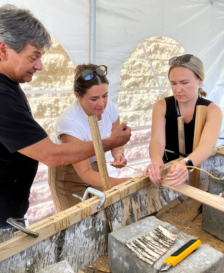 This week several classes came out to monitor daily progress and it was hands on if they wanted to sew on the single piece of bark, wrapping and weaving the string-like wood roots around the gunnels to securely and safely attach it.