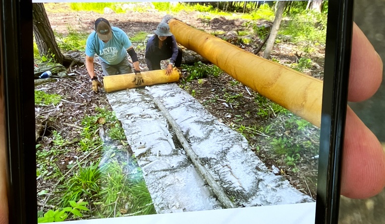 Commanda said he fell the four-foot round white birch this spring east of Algonquin Park in Maynooth, which is south of Whitney and Barry’s Bay. He rolled up the single piece and stored it till this week when after wetting unfurled it at the school.