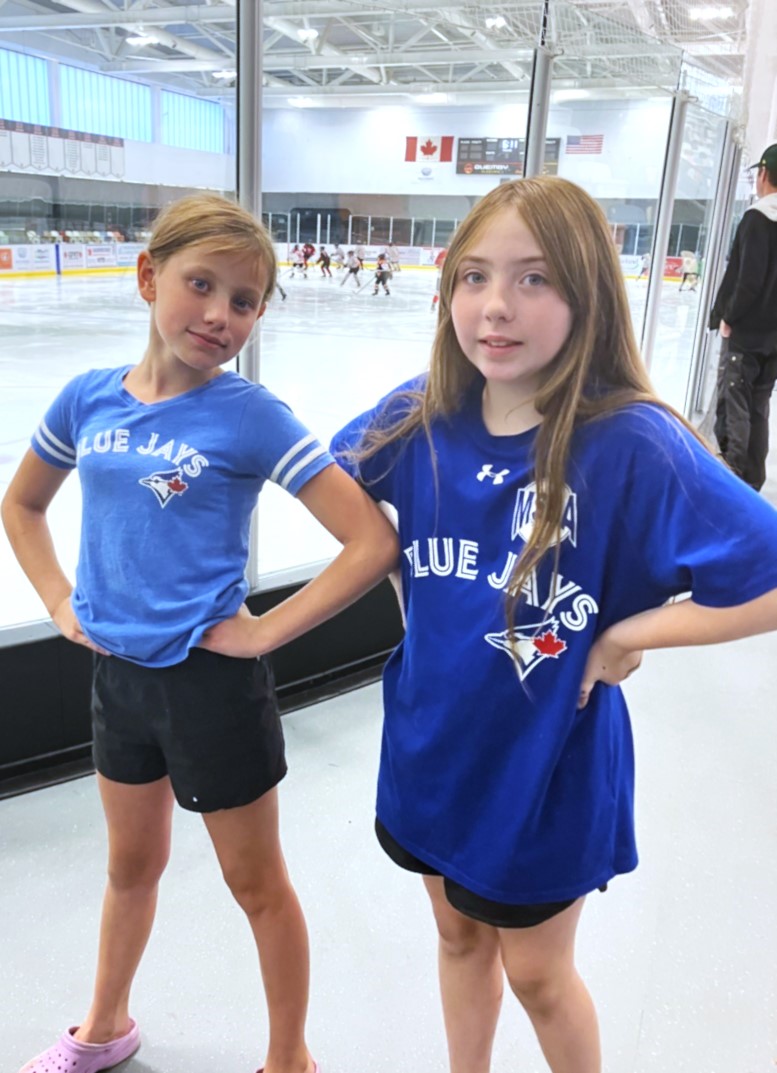 At Bracebridge’s arena last night Annabella Terry, 9, and friend Raeanna Taylor, 10, too, wore the blue as the neighbours cheered the Jays while watching a friend’s U13 hockey practice.