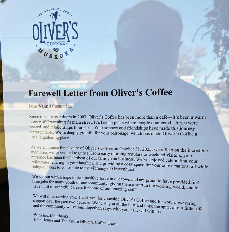 OCT. 31 OLIVER’S CLOSING MAY MAKE WAY FOR RETURN TO RESTAURANT ROOTS FOR MUSKOKA AND JAMES COFFEE ‘LOCAL,’ SAYS 34-YEAR BARISTA ENGLISH