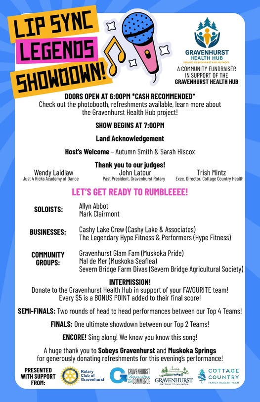 Seven acts — solos, duos and more — will mimic the words and motions of their favourite stars to raise more money for the medical addition being built upstairs next to the town hall at the Cottage Family Health Team clinic on Bethune Drive.