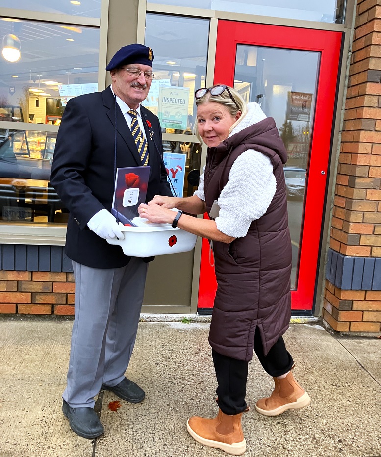Gravenhurst legion member Tim Coles accepts a donation from Leslie Johnston Friday at the start of a two-day poppy blitz, which continues tomorrow morning and afternoon across Muskoka. PHOTOS Mark Clairmont MuskokaTODAY.com