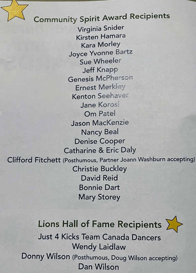 And inductions into the Lions Club Sports Hall of Fame at the Opera House for “Miss Wendy” Laidlaw, her Just 4 Kicks Team Canada Dancers and Donny and Dan Wilson.