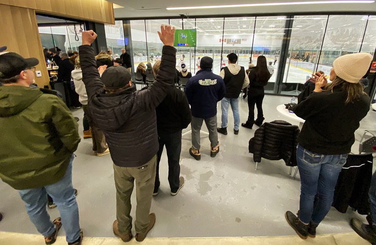 The hockey fans raised a beer and cheered.