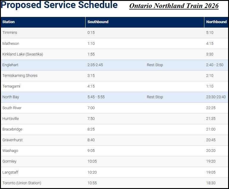 Tentative Ontario Northland schedule
