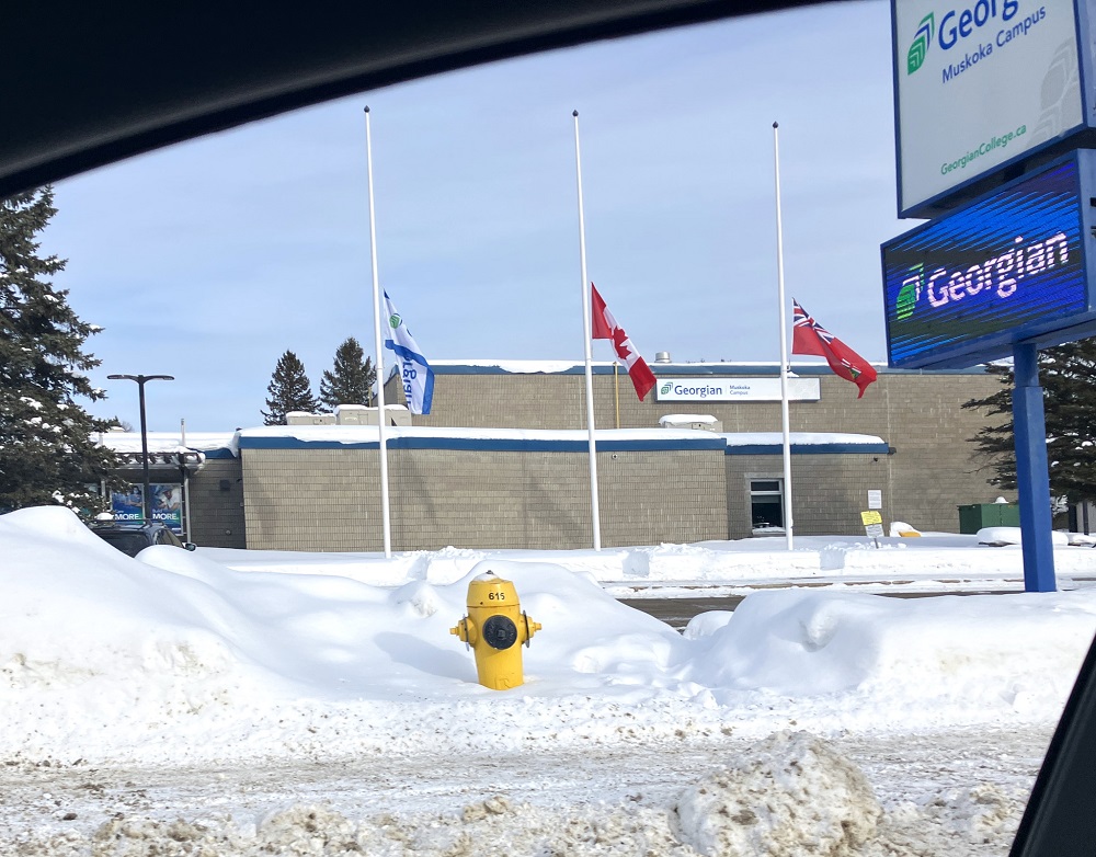 Georgian College had its own school flag, the Ontario ensign and the country’s flag glistening off and on in the sun this afternoon.