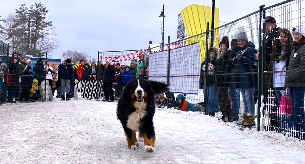- Riggins, a big Bernese, races to the finish line.