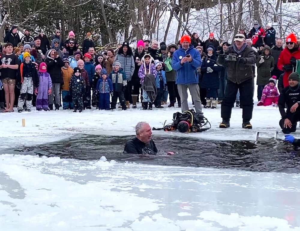 That’s Rotarian Harold Coffin today. Two minutes in Gull Lake’s 1 degree water to raise money for the club.