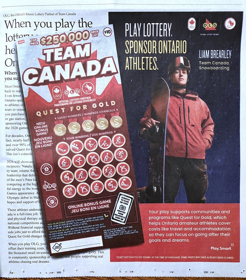 ‘Play Lottery and Sponsor Ontario Athletes’ by buying Team Canada scratch cards to help fund them in their ‘Quest For Gold.’