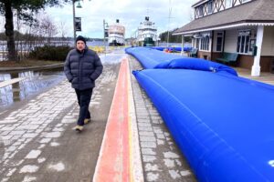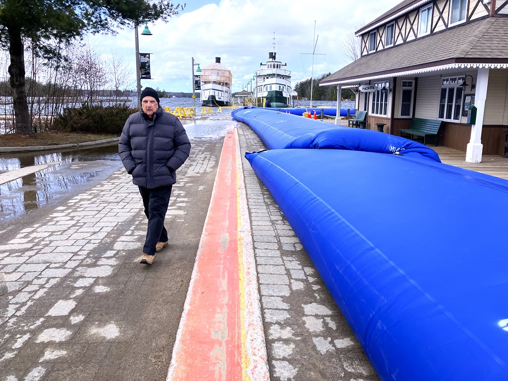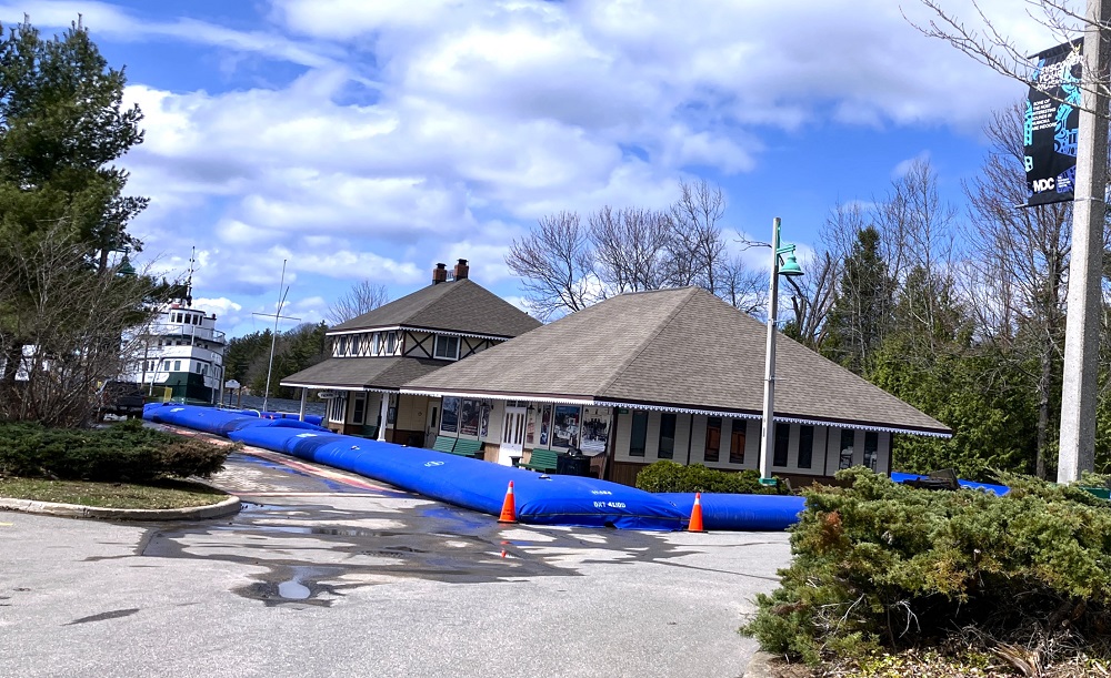 Sandbags are being monitored and topped up this weekend at many Muskoka locations, such as here at the Muskoka Wharf in Gravenhurst. For list of locations see here or at the district website.